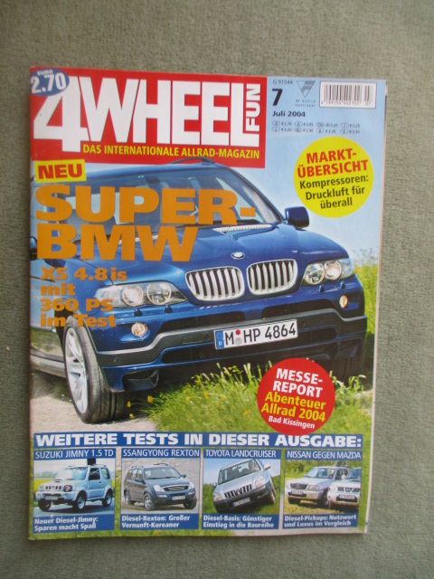 4 Wheel Fun Juli 2004, Test Ssangyong Rexton 2.9TD, Fahrbericht: Suzuki Jimny 1.5TD, Dauertest: Nissan Patrol GR 3.0DI, Test: BMW X5 4.8is E53,Toyota Land Cruiser 3.0 D-4D,VGT:Nissan Pickup vs. Mazda B 2500, Tuareg Rallye, Marktübersicht Luft-Kompressoren,Suzuki Vitara,gebrauchtes Heft