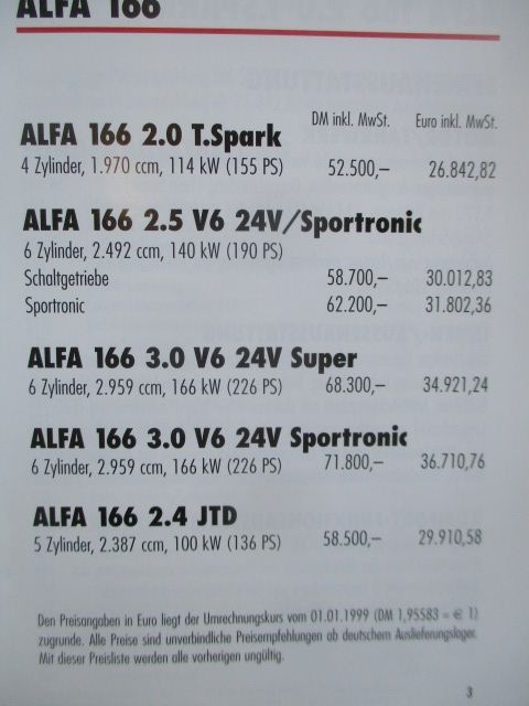 Alfa Romeo 166 Februar 1999, 2.0TS 114kw, 2.5V6 24V/Sportronic mit 140kw, 3.0 V6 24V Super/Sportronic 166kw,2.4JTD 100kw,neu