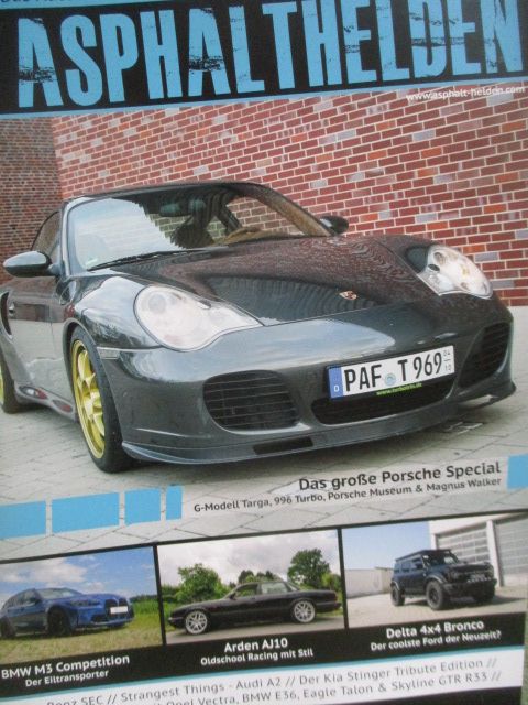 Asphalthelden Jahres 2024 mit: Arden AJ10, BMW M3 Competion G81, Delta 4x4 Bronco, Audi A2, Kia Stinger Tribute Edition, BMW E36,Eagle Talon und Skyline GTR R33,Opel Vectra A, Mercedes Benz 500SEC C126, Porsche 911 Carrera, 996 Turbo,schönes Heft