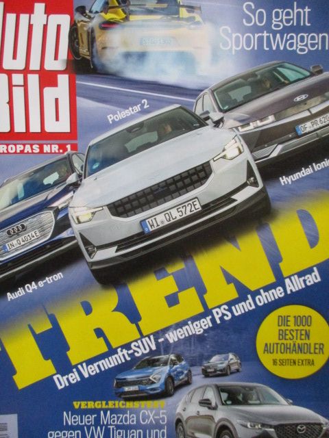 Auto Bild 12/2022 Mazda CX-5 D-150 AWD vs. Kia Sportage 1.6CRDI AWD vs. VW Tiguan 2.0 TDI 4Motion,Porsche Cayman GT4 RS, Audi Q4 e-tron vs. Hyundai Ioniq 5 und Polestar 2, gebrauchter Peugeot 5008,BMW 324td E30 Touring, ZAZ Tavria,neuwertiges Heft.