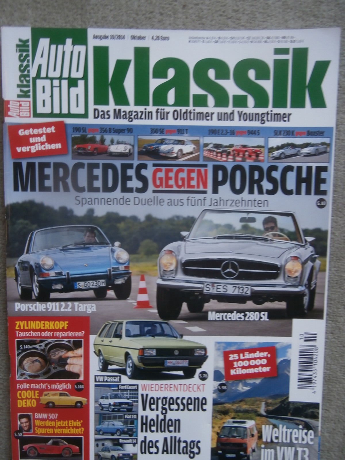 Auto Bild klassik 10/2014 911 2.2 Targa,280SL Pagode,356B Super 90,911T,SLK230 R170 vs. Boxster,VW Passat B1,Weltreise im VW T3,Ford Escort, Fiat 131 und Renault 14,Bonzen Volvo aus der DDR,BMW 507 von Elvis,Porsche 989,Unimog 2010,Dauertest Opel Monza,gebrauchtes Heft.