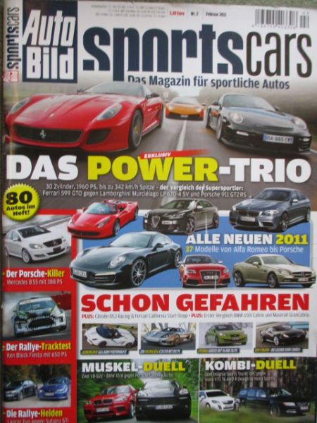 Auto Bild sportscars 2/2011 599GTO vs. 911 GT2 RS und Murcielago LP670-4 SV,Koenigsegg CCR Evolution,Gallardo Spyder CCR Evolution,Gallardo Spyder Performance,New Stratos,Seat Ibiza plus Je Design und Cupra,AC Schnitzer ACS3 2.0d cabrio,Väth CV25CGI,Fabia Combi RS, Lancer Evolution vs.WRX STi,Insignia Sports Tourer OPC vs. V70 T6 AWD by Heico Sportiv,Hyundai Genesis Coupé,Arile Atom V8,X5M Vs. Cayenne Turob, Ford Fiesta Gymkhana,Rieger Scirocco gestern/heute,gebrauchtes Heft.