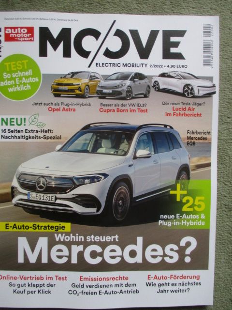 auto motor & sport Moove 2/2022 Lucid Air, Opel Astra, Cupra Born,Mercedes Benz C300 BR206 vs. 330e G20,Tazzari Zero,Toyota bZ4X,Kia EV6,Mercedes EQE,Renault Mégane,Vergleich: Mini SE vs. honda e vs. Fiat 500e,Mégane vs. Seat Leon,VG:Audi Q3 vs. Peugeot 3008 vs. VW Tiguan,neuwertiges Heft.