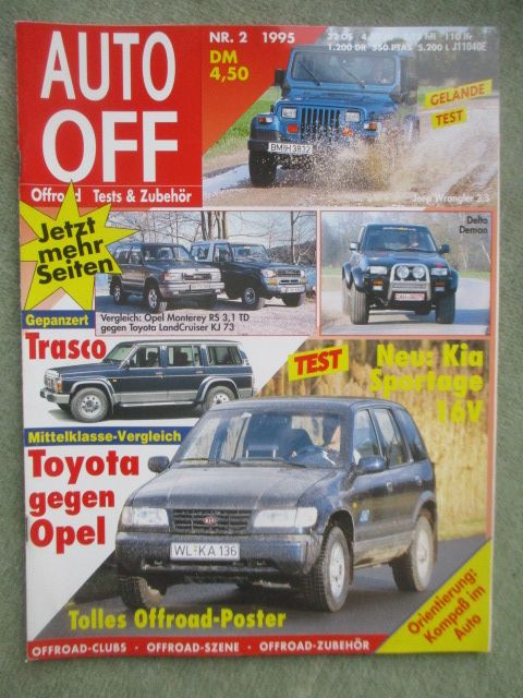 Auto Off 2/1995 Tests & Fahrberichte:Delta Demon Bigfoot Umbau des Ford Maverick Delta 4x4, Kia Sportage 16V,Jeep Wrangler 2.5, Tasco Patrol GR, Opel Monterey RS 3.1 TD und Toyota Landcruiser KJ73, Im Reich der Haschemiten, Heft mit Poster.