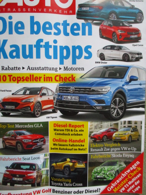 Auto Strassenverkehr 12/2020 Kaufberatung VW Golf8,A6 40TDI vs. BMW 520d G30 vs. E220d vs. S90 D5 AWD,GLA 220d 4Matic,Renault Zoe vs. VW e-up,Peugeot 508 SW Hybrid 225e,Subaru Forester 2.0ie,gebraucher VW T5 (2009-2015),gebrauchtes Heft.