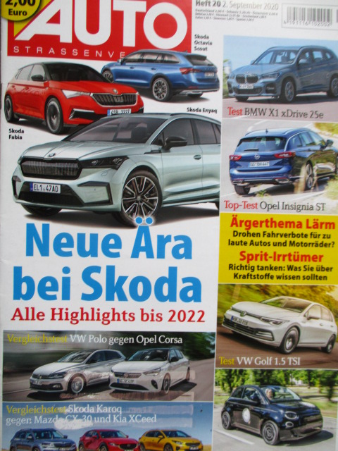 Auto Strassenverkehr 20/2020 bMW X1 xdrive25e,Insignia ST, VW Golf8 1.5TSI,Fiat 500e,Renegade 4xe,Vergleichstest Corsa 1.5D vs. VW Polo 1.6TDI,Kia XCeed 1.4T-GDI vs. CX-30 G150 AWD vs. Karoq 1.5TSI,gebrauchter Auris Touring Sports mit Hybridantrieb.