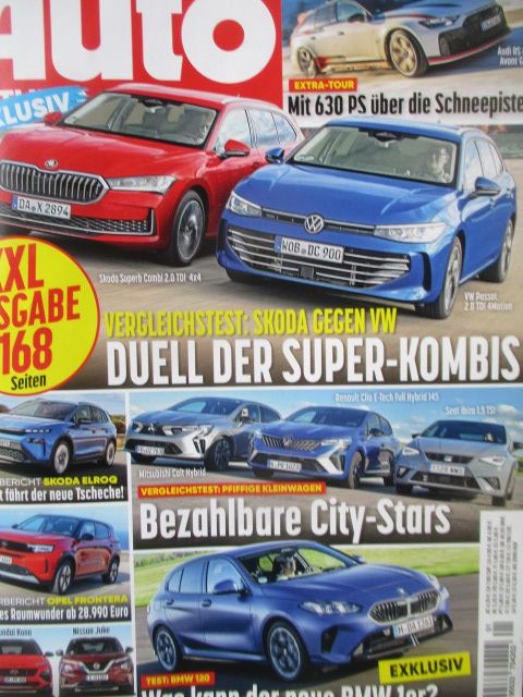 Auto Zeitung 1/2025,Test und Fahrberichte: Skoda Elroq, Opel Frontera, VGT: Skoda Superb Combi 2.0TDI 4x4 und VW Passat 2.0lTDI 4Motion,VGT: Mitsubishi Colt und Renault Clio und Seat ibiza,Gebrauchtwagen: Hyundai Kona und Nissan Juke, Audi RS6 Avant GT, Kaufberatung BYD Sealion 7,Klassik Vergleich: BMW 2002 turbo und 911 Turbo 3.3 und Saab 99 Turbo, Mercedes V-Klasse Marco Polo Horizon, Rolls-Royce Spectre Miniatur in 1:8,neuwertiges Heft.