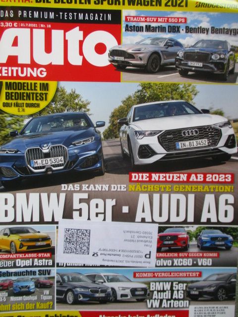 Auto Zeitung 16/2021 Aston Martin DBX vs. Bentley Bentayga,Glas 1700 und Simca 1300,DS9 E-Tense 225,Macan GTS,Gemballa Marsien,Ford Puma und Hyundai Kona, Citroen C3 Aircross, Citroen e-Spacetourer, Volvo V60 vs. SC60, Mercedes EQV und Zafira e-Life und Peugeot e-Traveller,Gebrauchtwagen: Mazda CX-5,Nissan Quashqai und VW Tiguan,Peugeot 9X8 Hypercar,Vergleich: BMW 540i xDrive Touring G31 vs. A6 Avant 55 TFSI quattro und VW Arteon R Shooting Brake,gebrauchtes Heft.