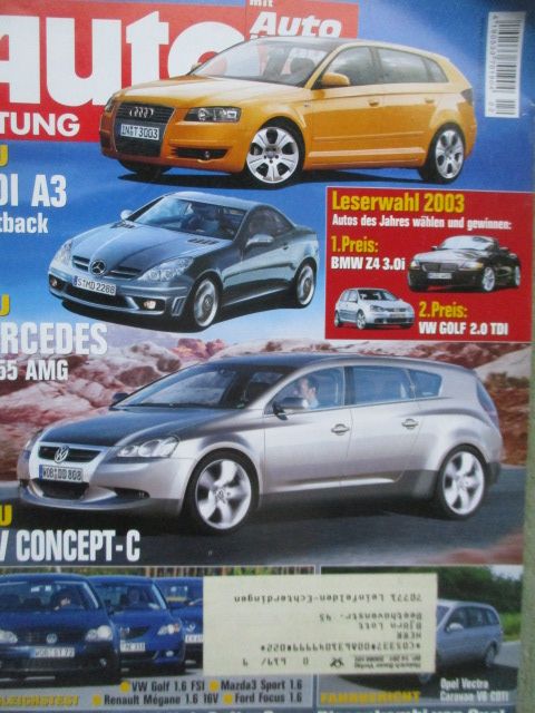 Auto Zeitung 22/2003,Tests und Fahrberichte: VW Golf 1.6FSI und Ford Focus 1.6 und Mazda3 Sport 1.6 und Renault Mégane 1.6 16V, Chrysler Crossfire gegen Mercedes SLK 230 Kompressor,Opel Vectra Caravan 3.0CDTi, Alfa Romeo 166 2.4 JTD 20V, Ferrari F40,Gebrauchtwagen: Fiat Bravo/Brava, Special Hyundai, Mercedes SLR McLaren Roock Audi A3 RSA 170,gebrauchtes Heft
