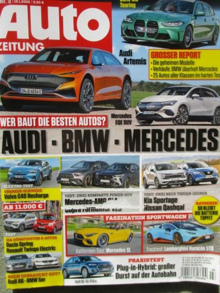 Auto Zeitung 3/2022 Audi vs. BMW und Mercedes,Cupra Formentor VZ5 und Mercedes Benz AMG GLA,Bentley Flying Spur Hybrid, Kia Sportage und Nissan Qashqai,Volvo C40 Recharge Twin, Faszination Mercedes SL,Audi Q5 Sportback 55 TFSI e,Lamborghini Huracán STO,Ford Taunus vs. Volvo PV544, Eura Mobil Profila,Dacia Spring vs. Renault Twingo Electric,Genesis G70 Shooting Brake 2.0T Plus AWD vs. VW Arteon Shooting Brake 2.0TSI 4Motion,BMW 5er Touring F11 und Audi A6 Avant,beschädgites Heft,