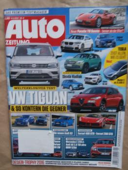 Auto Zeitung 9/2016 Skoda Vision C, Boxster, A4 allroad quattro, Ferrari California T, VW Tiguan, Vergleich: Audi A6 2.0TDI ultra vs. BMW 520d G30 vs. E220d BR213,Vergleich Kombis: Astra K Sports Tourer 1.0Ecotec vs. 308SW PureTech 110 vs. Golf Variant 1.0TSI BlueMotion,BMW X4 M40i F26,Vergleich BMW M20 vs. Civic Type R vs. AMG A45 vs. WRX STi,Toyota Prius, Langstrecken WM Sport Audi R18 und Porsche 919 und Toyota TSO50,Porsche Cayenne Turbo S vs. Bentley Bentayga, gebrauchtes Heft.