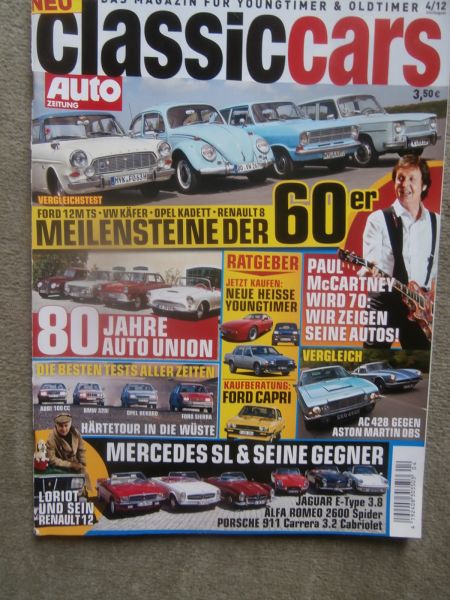 Auto Zeitung classicars 4/2012 Ford 12M TS vs. Käfer vs. Kadett vs. Renault 8,Typ44 vs. 320i E30 vs. Rekord E vs. Sierra,Mercedes Benz SL vs. E-type 3.8 vs. Alfa Romeo 2600 Spider v.s 911 Carrera 3.2 Cabriolet,AC428 vs. Aston Martin DBS,Kaufberatung Fod Capri,80 Jahre Auto Union,gebrauchtes Heft.