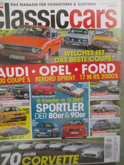 auto zeitung classiccars 4/2023 Vergleichstest Audi 100 Coupé S (C1) und Opel Rekord Sprint und Ford 17 M RS 2000S,Kaufberatung:Audi S3 (8L) und Datsun 280ZXT,70 Jahre Chevrolet Corvette, Rover Vitesse vs. Morgan Plus 8,Fiat 600 Viotto Coupé,Face Vega Excellence,Audi Quattro,BMW M3 E30,Alfa Romeo 75 Turbo,Ford Escort RS Cosworth,Lancia Delta HF Integrale 16V, Mercedes Benz 190E 2.3-16 W201,Porsche 924 Carrera GT,Renault Clio GT, Subaru Impreza GT Turbo,VW Rallye Golf,VGT: Opel Kapitän L (P 2.6) und Mercedes Benz 220SE und Lancia Flaminia 2.8,Skoda 445,R19 RT 1.8S und VW Golf III GL,Porsche 956 und 962,gebrauchtes Heft