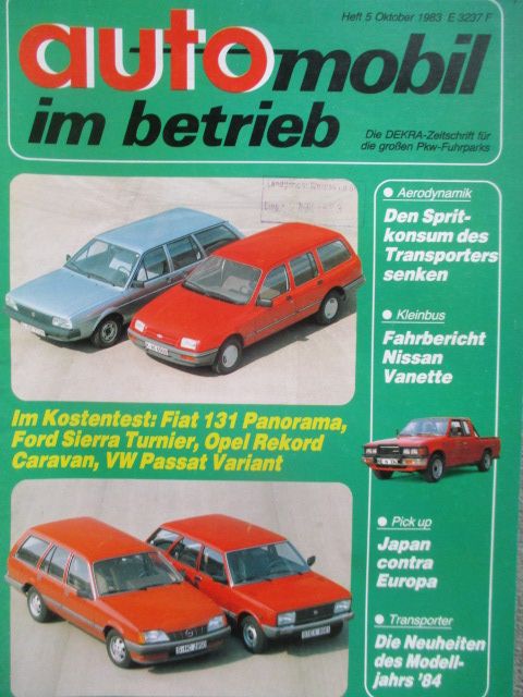 automobil im betrieb 10/1983,Vergleichstest Kosten Fiat 131 Panorama vs. Ford Sierra Turnier vs. Opel Rekord E Caravan vs. VW Passat Variant Typ32B,Nissan Pickup vs. VW Caddy,Toyota Hi-Lux Pickup,Fahrbericht Nissan Vanette,gebrauchtes Heft.