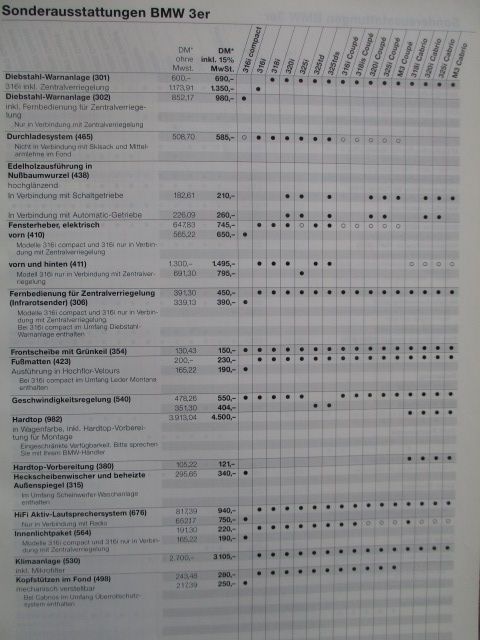 BMW 3er E36 5er E34 7er E38 8er E31 +M3 +M5 +touring Preisliste Juni 1994