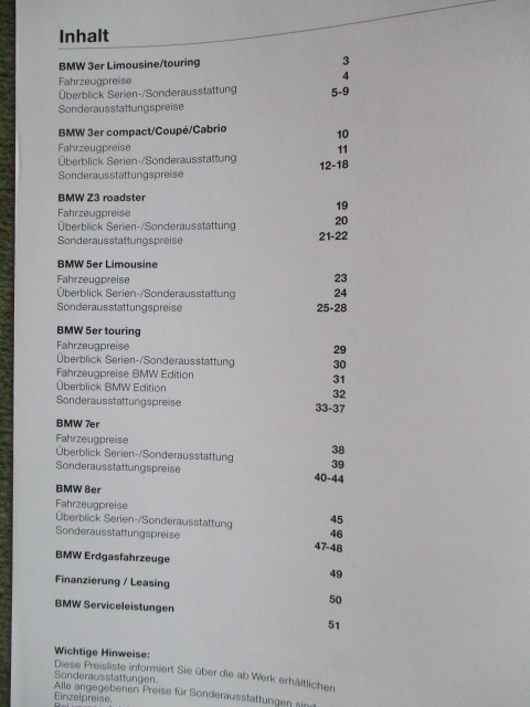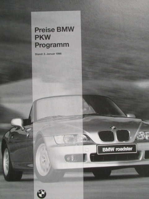 BMW 3er Reihe E36 +compact E36/5,Z3 roadster, 5er Reihe E39, E34 Touring Edition,7er E38,8er E31,Erdgasfahrzeuge 2.Januar 1996,51 Seiten stark, mit Grund- & Sonderausstattungen.