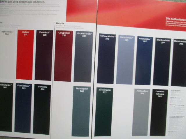 BMW 3er Reihe E36 September 1996,Farben: Unilacke: 300,314,328,307,263,668,Metallic: 252,398, 288,299,295,367,297,302,275,309 und 303,Stoffe: Jacquard,Floc,Wollvelours, Epinglé-Wollvelours Kombination,Stoff Flachgewebe, Stoffe/Leder,gebrauchter Zustand.
