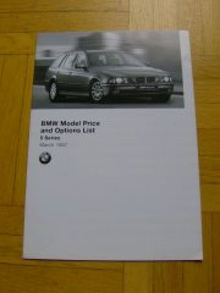 BMW Model Price and Options list 5 series E39 1997 Australia, für den australischen Markt, enlgisch, Stand: März 1997, Modelle 523i, 528i+touring, 535i und 540i, guter Erhaltungszustand, Format ca. A5, sehr selten.