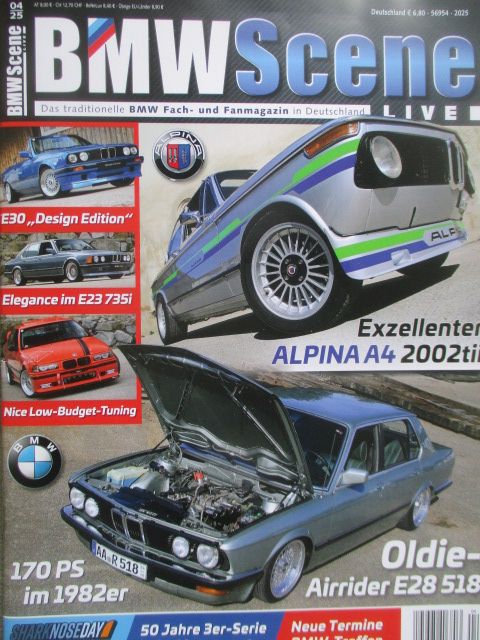 BMW Scene Live 4/2025 mit 518 E28, 2002ti Alpina A4 E10, 735i E23, 36i E30, 2002tii, M3 E30 Sport Evolution, 730iA E38, 318i E30 Cabriolet Design Editon,Mini JCW, X6 M F96 LCi,40 Jahre Ahrend 02-Tuning,schönes Heft.