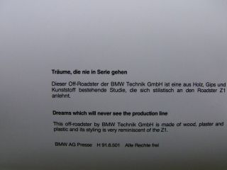 BMW Studie Off-Roader Z1 1991 Pressebild Rarität, sehr selten, leicht wellig durch die Lagerung.