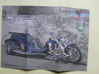 Boom Trikes Fighter X11, Mustang ST1 Prospektblatt 2 Seiter, 2 Farbfotos, A4 Format,neu.