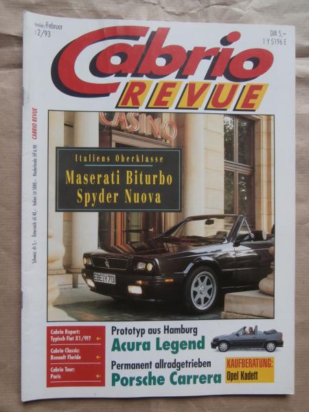 Cabrio Revue 1-2/1993 Maserati Biturbo Spyder Nuova, Opel Kadett E Cabriolet Kaufberatung, 911 C4,Acura Legend,Renault Floride