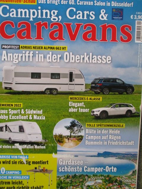 Camping,Cars & caravans 9/2021 Dethleffs E.Home Cocco und Audi e-tron,Adria Alpina 663HT,Mercedes Benz E450 4Matic T-Modell All-Terrain,gebrauchtes Heft.