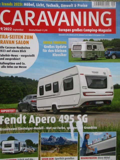 caravaning 9/2022 Fendt Aepro 495SG,LMC Tandero 500E,Fendt Tendenza 550SG,Eriba Touring,Mazda CX-5,Volvo C40 Recharge,gebaruchtes Heft.