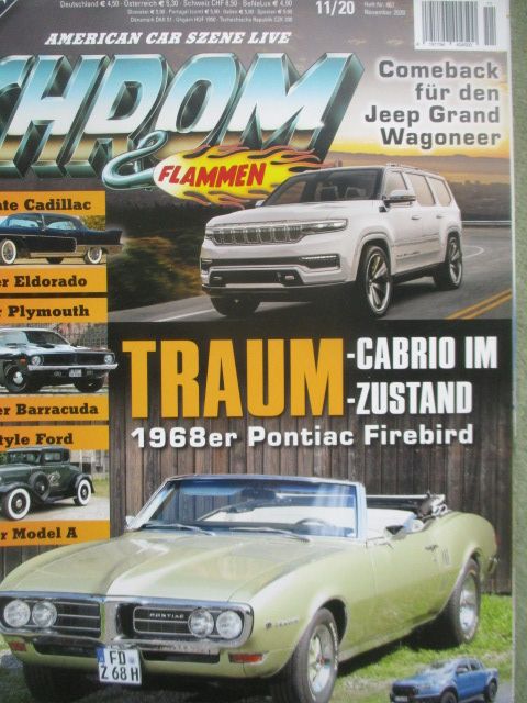 Chrom & Flammen 11/2020,68er Pontiac Firebird Cabriolet, 57er Cadillac Eldorado Brougham,Jeep Grand Wagoneer, 76er Chevrolet Camaro by Frua, 67er Mercury Monterey Convertible, 74er Plymouth Barracuda, 67er Buick Wildcat,31er Ford Model A Coupé,Frod Ranger Raptor, Poster liegt bei.
