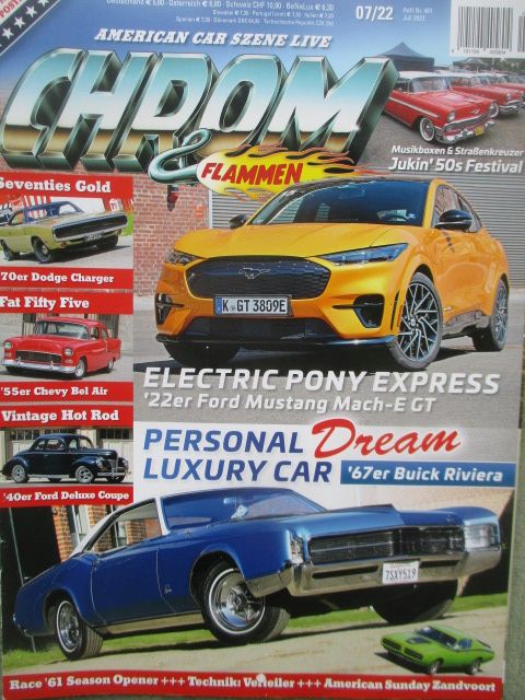 Chrom & Flammen Juli 2022, mit 1955er Chevrolet Bel Air, 67er Buick Riviera, 70er Dodge Charger 500, 2022er Shelby GT-H & GT500-H,194er Ford Deluxe Coupé, 85 Jahre Mopar Teil1, 1970er Oldsmobile 440 W-30, 2022er Ford ustang Mach-E GT, gebrauchtes Heft