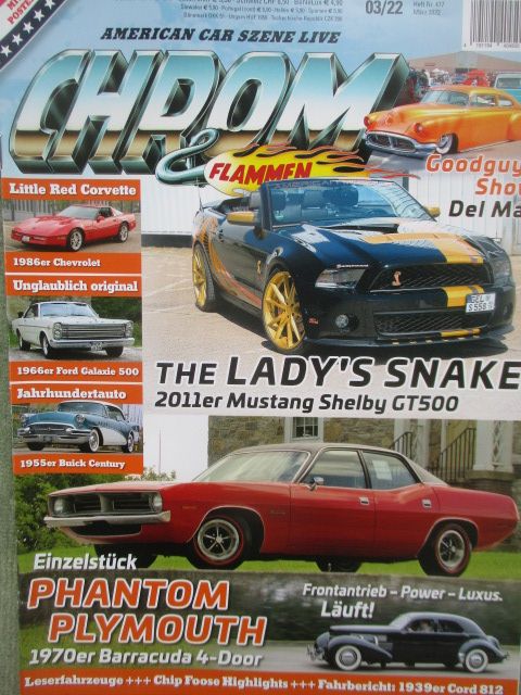 Chrom & Flammen März 2022, 70er Plymouth Barracuda 4-Door, 2011er Ford Mustang Shelby GT 500 Covertible, 66er Ford Galaxie 500, 86er Chevrolet Corvette coupe, 67er Buick Riviera, 55er Buick Century, 39er Chevrolet Coupe, 1937er Cord 812 S/C Custom Beverly, 81er DeLorean DMC-12,schönes Heft