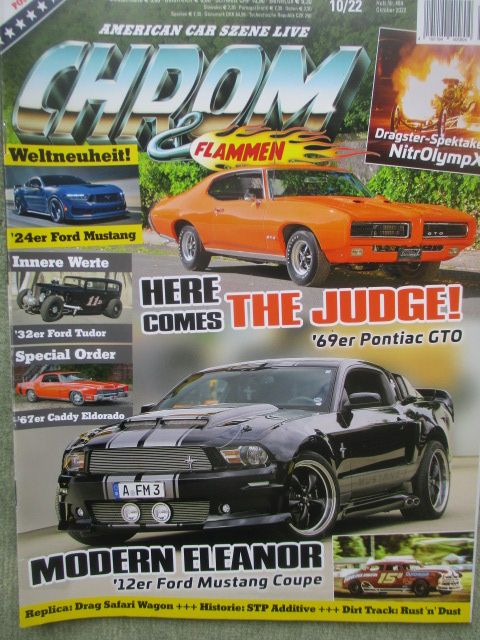 Chrom & Flammen Oktober 2022 mit 69er Pontiac GTO, 40er Ford 1/2-ton Pickup,67er Cadillac Eldorado, 54er Dodge Suburban Drag Safari Station Wagon, 2012 Mustang V6 Coupé Special Cervini, 32er Ford Tudor Hot Road, ohne Poster,Angebot!