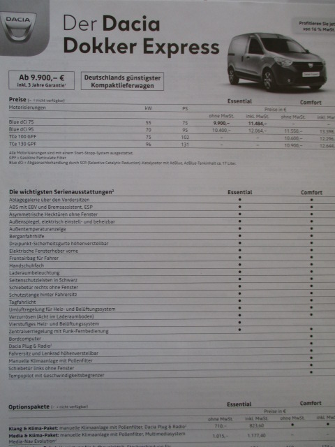 Dacia Dokker Express Preisliste Juli 2020,4 Seiten stark, Leistung: 55kw,70kw,75kw und 96kw.