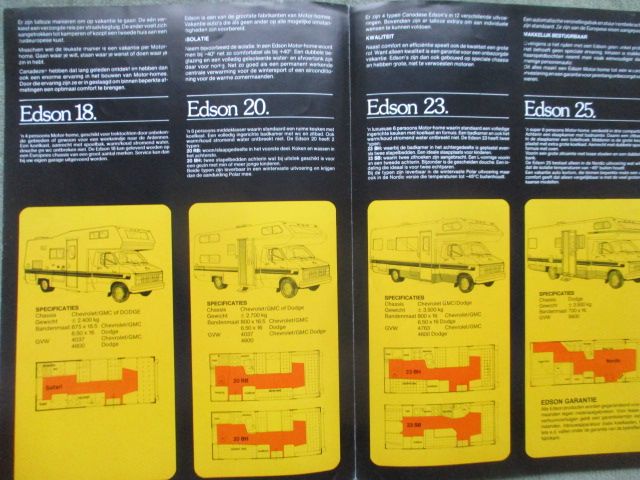 Edson Wohnmobil Prospekt Niederlande,4 Seiten stark,niederländischer Text,Modelle: 18,20,23 und 25,gebrauchter Zustand,ohne Datum.