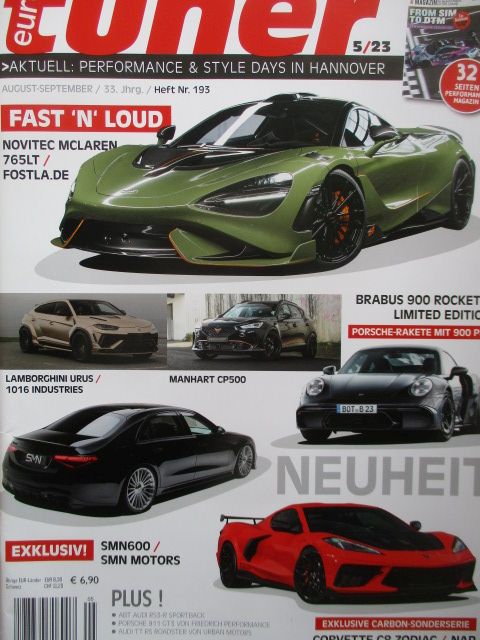 euro tuner 5/2023,McLaren 765LT,Porsche 911 GT3,Lamborghini Urus,VW Country Golf-Concept VIII Delta 4x4,SMN600 Mercedes Benz S580 4Matic BR223,Zodiac Chevrolet Corvette C8,Toyota GR Supra 3.0,Nissan Skyline GT-R V-Spec R34 von HK-Power,Brabus 900 Rocket R 1 of 25 (Porsche 911 Turbo S),Abt RS3-R Sportback (RS3),Manhat CP500 (Basis Cupra Formentor VZ5),Mercedes-AMG GT von HS Motorsport,BMW M760Li von Infinitas G12,Mercedes-AMG GLE 63 S von K.A.R. Tuning,KBR Motorsport VW T6.1,G-Power G3M Biturbo (Bais BMW M3 Touring G81),neuwertiges Heft.