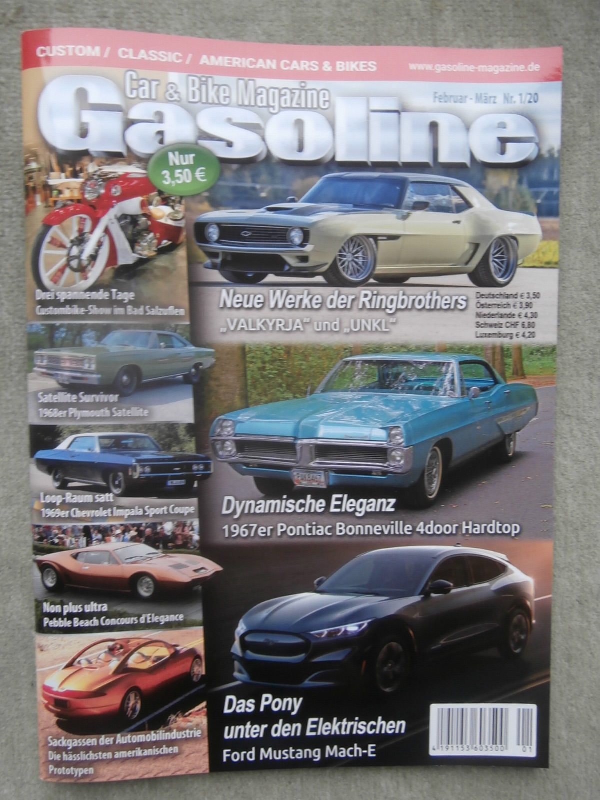 Gasoline Car & Bike Magazin 1/2020 67er Pontiac Bonneville 4door Hardtop,68er Plymouth Satellite,Ford Mustang Mach-E, 69er Chevrolet Impala Sport Coupé,36er Ford Deluxe 3 Window Coupé,69er Mustang Mach 1 UNKL,67er Oldsmobile 442,gebrauchtes Heft.