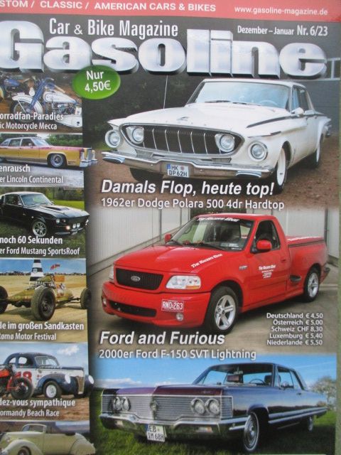 Gasoline Car & Bike Magazin 6/2023,2000er Ford F-150 SVT Lightning,1979er Lincoln Continental Town Car, 68er Ford Mustagn SportsRoof,68er Imperial Crown Coupé,Dodge Poloar 500 dr Hardtop 1962, 64er Buick Wildcat 2dr Hardtop,65er Chevrolet El Camino,72er Chevrolet K5 Blazer RASKAL,neuwertiges Heft.