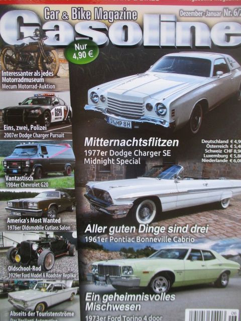 Gasoline Car & Bike Magazin 6/2024, 77iger Dodge Charger SE Midnight Special,61er Pontiac Bonneville Cabrio, 84iger Chevrolet G20, 76er Oldsmobile Cutlass Salon, 29er Ford Model A Roadster Replika, 73er Ford Torino 4door Pillared Hardtop, 07er Dodge Charger Pursuit, 65er Ford F-100 Longbed, neuewertiges Heft