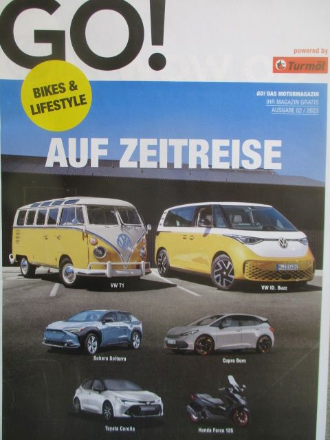 GO! 2/2023,u.a. mit Audi Quattro,Subaru Solterra,Cupra Born,Toyota Corolla,Skoda Kamiq,MG4,Megane E-Tech,VW T1 und VW ID.Buzz,Honda Forza 125,Heft aus Österreich,neuwertiger Zustand,46 Seiten stark.