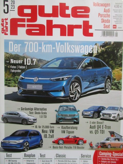gute fahrt 5/2023, Porsche 718 Boxster,VW ID.7,Kaufberatung VW Tiguan,Skoda Scala 1.0TDI,Audi Q4 E-tron vs. Q5 TDI,Karmann Ghia Typ35 von Lorenz,Seat Arona 1.5TSI,Caddy Camp2,Porsche 959 Paris-Dakar,Custom-Bus Purist T6.1,Gebrauchtwagen: Audi Q3 ab 2018,VW Touareg V6 TDI,neuwertiges Heft.