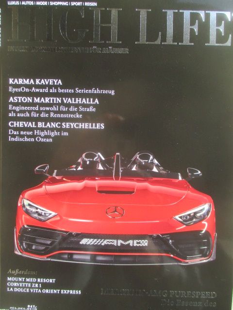 High Life Frühjahr 2025 mit Karma Kaveya,Astobn Martin Valhalla, Corvette ZR1, Mercesdes-AMG Purespeed, Aston Martin Valhalla, Maserati GranCabrio Folgore Tiganello,Aston Martin DB12 Goldfinger Edition by Q 1 of 60 cars, Ferretti Yachts, schönes Heft