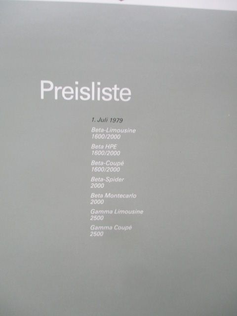 Lancia Preisliste 1. Juli 1979,Modelle: Beta-Limousine 1600/2000,Beta HPE, Beta-Spyder 2000,Beta Montecarlo, Gamma Limousine 2500,Gamma Coupé 2500,4 Seiten stark mit Abbildungen,neuwertiger Zustand,sehr selten.