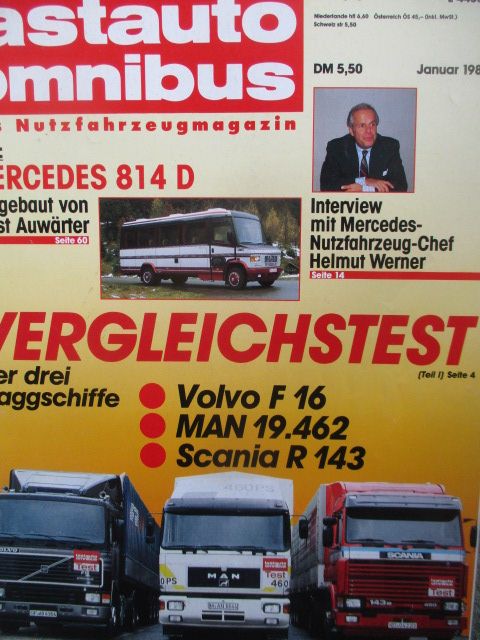 lastauto omnibus Januar 1989, Vergleichstes: Volvo F16 vs. MAN 19.462 und Scania R 143, Chrysler Voyager, MAN NL 202, Test Ernst Auwärter Economy auf Mercedes Benz 814 D,gebrauchtes Heft.