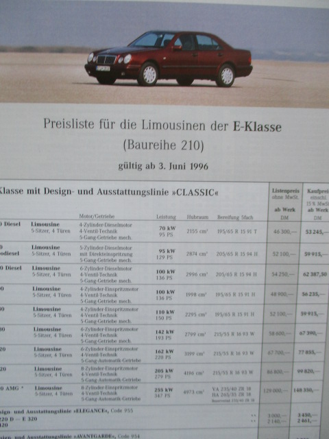 Mercedes Benz E-Klasse W210 3.Juni 1996 E220D E290TD E300D E200-E50 AMG Preisliste