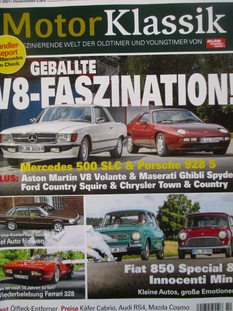 Motor Klassik 10/2021 Mercedes Benz 500SLC R107 vs. Porsche 928S,Opel Senator A,Fiat 850 Special und Innocenti Mini,Maserati Ghibli Spyder 4.7 und Aston martin V8 Volante,Chrysler Town & Country und Fors Country Sqire,Audi RS4 (B5),Käfer Cabrio,,Mazda Cosmo,Ferrari 328GTS,Pagode SL,540K Cabriolet,SL280 R129,gerauchtes Heft.