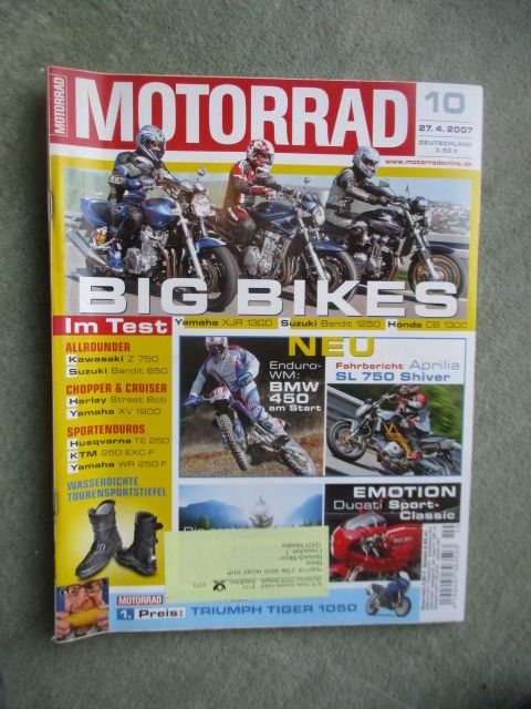 Motorrad 10/2007 Test und technik: Fahrbericht Aprilia SL 750 shiver,Test: Kawasaki Z 750,Suzuki Bandit 650S,Vergleich Chopper vs. Cruiser Harley-Davidson Dyna Street Bob und Yamaha XV 1900 Midnight Star, Zupin-Ducati 1098, VGT: Honda CB 1300 und Suzuki Bandit 1250 und Yamaha XJR 1300, Ducati Sport-Classic 1000S,Offroad Vergleich: Husqvarna TF250 und KTM 250 EXC-F und Yamaha WR 250f, Test wasserdichte Tourensportstifel,Isle-of-man Fahrer Karstem Schmidt,gebrauchtes Heft