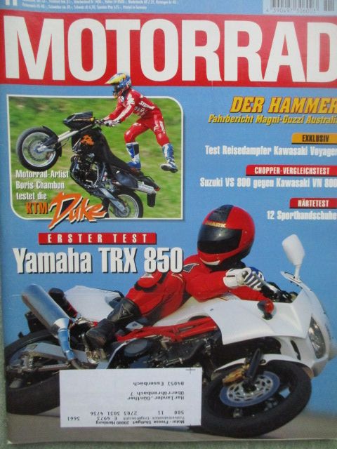 Motorrad 11/1995,Test:Yamaha TRX 850,VGT Chopper: Suzuki VS800 und Kawasaki VN800,KTM Duke 620, Kawasaki Voyager XII,Magni-Guzzi Australia,Gebrauchtkauf Honda CBX 1000,gebrauchtes Heft.
