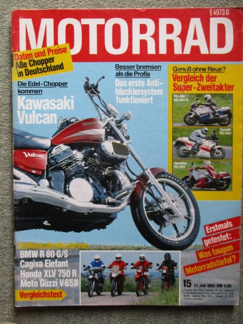 Motorrad 15/1985 Vergleich Honda NS400R vs. Suzuki RG500 vs. Yamaha RD500,Enduros BMW R80 G/,Cagiva Elefant,Honda XLT 750R,Moto Guzzi V65II,Kawaski Vulcan,Harley-Davidson 883 Evoluton Sportster,gebrauchtes Heft.