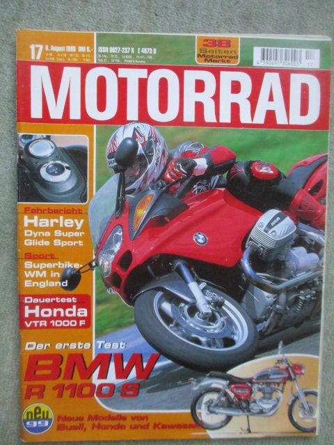 Motorrad 17/1998 Test & Technik:BMW R1100S, Fahrbericht: Harley-Davidson Dyna Super Glide Sport und Buell X1 mit Einspritzung,Vergleich 34-PS Cruiser Honda VT 1100CS und Kawasaki VN 1500, Dauertest: Honda VTR 1000F, Gebrauchtkauf: Kawasaki GT 550,Bremsen Tuning,gebrauchtes Heft
