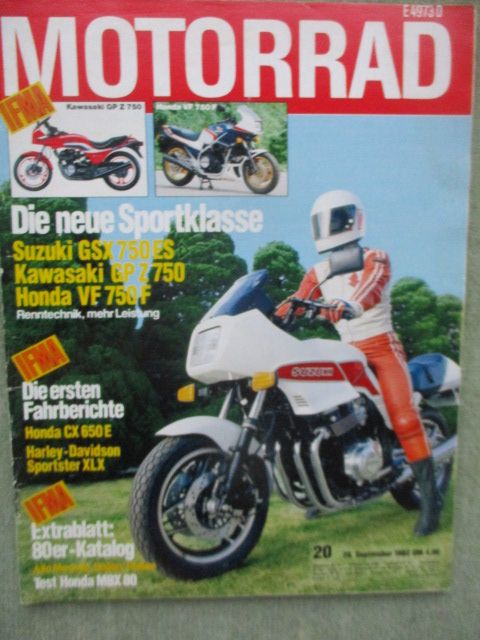 Motorrad 20/1982, im Blickpunkt: Suzuki GSX 750ES,Kawasaki GP Z750,Honda VF 750F,Test: Harley-Davidson XLX,Honda CX 650E, Yamaha XT550,Honda MBX 80,gebrauchtes Heft.